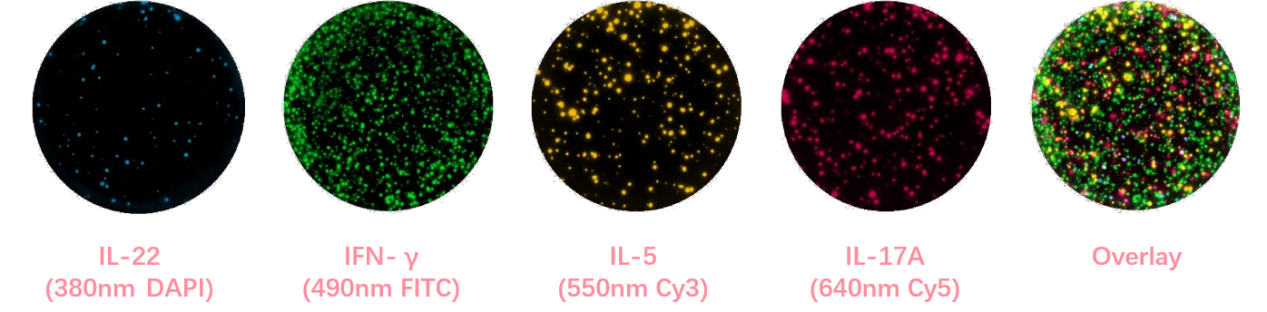 該圖為Mabtech FluoroSpot Plus: Human IL-22/IFN-γ/IL-5/IL-17A(Cat#FSP-18010803-2)的實驗結(jié)果,四個檢測通道對應(yīng)的DAPI,F(xiàn)ITC,Cy3,Cy5。