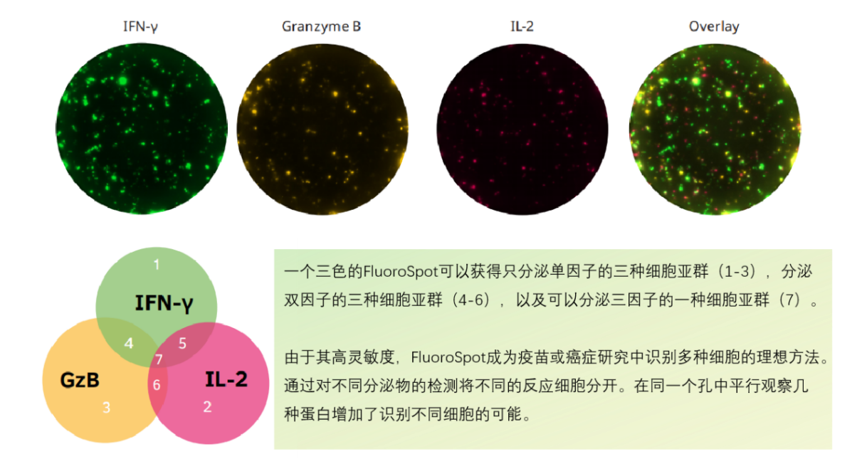 相比于ELISpot,F(xiàn)luoroSpot依舊維持了ELISpot的高靈敏度,還能對單細(xì)胞分泌的多種細(xì)胞因子同時進(jìn)行檢測,從而實現(xiàn)細(xì)胞亞群的鑒定和細(xì)胞多功能性分析。