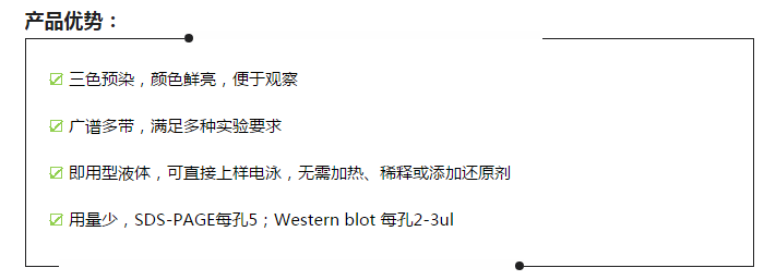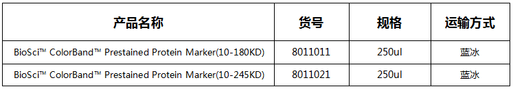 BioSciTM ColorBandTM Prestained Protein Marker產(chǎn)品應(yīng)用于SDS-PAGE凝膠電泳時,可實時監(jiān)測蛋白樣品的分離情況,也可以用于評估Western轉(zhuǎn)膜(PVDF、尼龍或硝酸纖維素膜)效率,并粗略的估計蛋白樣品的分子量。