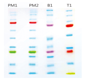 BioSciTM ColorBandTM Prestained Protein Marker 是一種三色預(yù)染的即用型蛋白分子量標準品,包括十種分子量從的預(yù)染重組蛋白,經(jīng)SDS-PAGE凝膠電泳或轉(zhuǎn)膜后可觀察到清晰的彩色蛋白條帶,其中25KD為綠色條帶,75KD為紅色條帶,其余條均為藍色條帶。