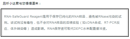 將RNA-SafeGuard Reagent (20X)用滅菌水稀釋成1X濃度,65°C反應(yīng)20分鐘滅活水中、瓶中的RNase。剩余的1X RNA保存液