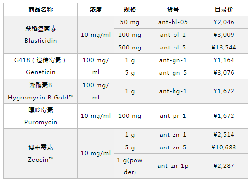 達科為生物是InvivoGen公司在中國的一級代理,并且和InvivoGen一直都有良好的合作,達科為準備了大量InvivoGen篩選抗生素現(xiàn)貨,即日起篩選抗生素下列現(xiàn)貨參加6折促銷活動: