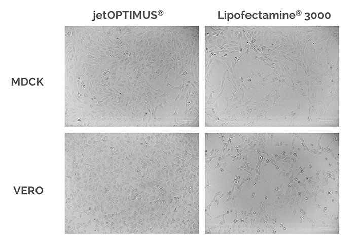 △圖2. 使用jetOPTIMUS?轉染24小時后,細胞仍然健康并保持良好形態(tài)。根據(jù)L3K和jetOPTIMUS?說明書要求進行轉染,24小時后在相差顯微鏡下觀察MDCK和VERO細胞的狀態(tài)。