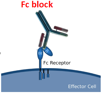 因此,在流式實(shí)驗(yàn)過程中,除非檢測(cè)細(xì)胞中Fc受體的表達(dá),通常我們會(huì)使用純化的抗體來進(jìn)行Fc受體的封閉,如圖: