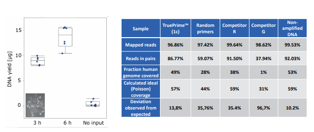 TruePrime?采用MDA技術(shù),基于新型的TthPrimPol 引物酶和Phi29 DNA聚合酶,擴增過程無需添加隨機引物,減少了擴增偏倚,提高了擴增過程的覆蓋率和保真性,并且對于污染的外源DNA不敏感,可重復性好。TruePrime?可用于單個細胞或少量細胞的全基因組擴增,與常見的NGS平臺如Illumina和IonTorrent等兼容性良好。