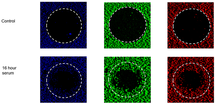 細胞排斥區(qū)分析(間隙封閉法)是Platypus公司獲得專利的技術(shù)。讓細胞在孔的底部圍繞一個阻止細胞生長的區(qū)域(如在孔底部中央放置阻塞物)生長,實驗在移除阻塞物后開始,可觀察單層細胞遷移到原先的空白區(qū)域中。