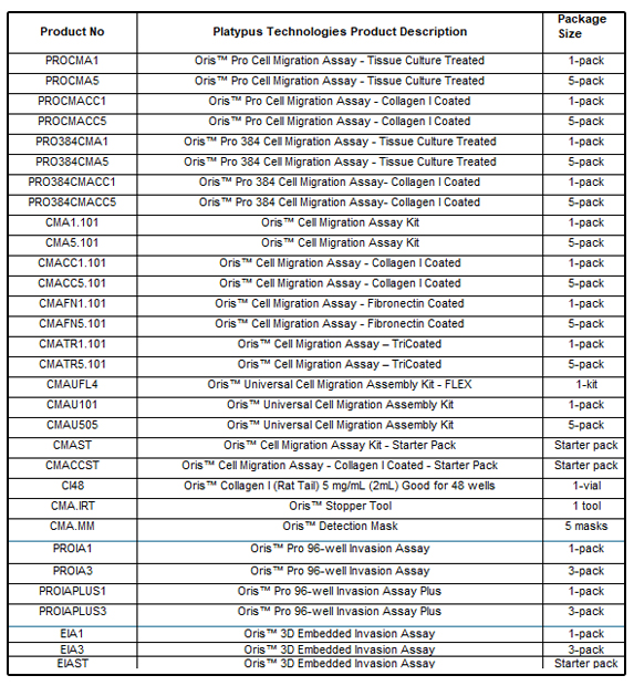 美國Platypus Technologies公司建立于2000年,是細胞分析領(lǐng)域產(chǎn)品的耗材供應(yīng)商,熱賣產(chǎn)品為OrisTM和OrisTM Pro系列細胞遷移和侵襲實驗試劑盒。其開發(fā)的用于檢測細胞遷移和侵襲的細胞排斥區(qū)分析法,克服了Transwell和劃痕實驗的缺點。