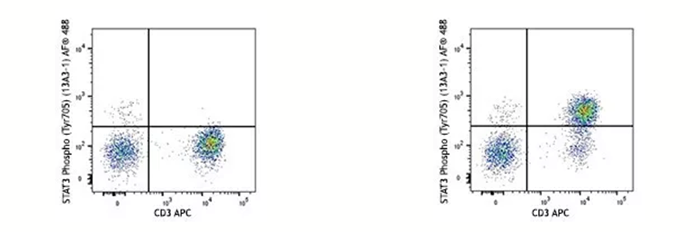 在蛋白翻譯后修飾(磷酸化、乙酰化、甲基化等)的研究過(guò)程中,固定劑不僅可以有效的“固定”住翻譯后修飾的位點(diǎn)(絲氨酸、蘇氨酸、酪氨酸等),也可以防止目標(biāo)位點(diǎn)在活細(xì)胞中很快降解(比如磷酸酶會(huì)去除磷酸化修飾、去甲基化酶會(huì)移除甲基化修飾等)。下面的例子是用IL-6的重組蛋白刺激人外周血15分鐘后看STAT3第705位酪氨酸的磷酸化水平,在刺激完樣本后就需要通過(guò)固定來(lái)實(shí)現(xiàn)目的氨基酸磷酸化水平“停留”在IL-6刺激15分鐘這個(gè)節(jié)點(diǎn)上。