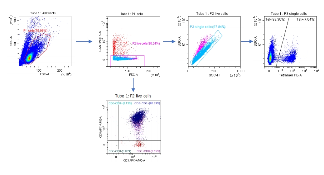 5、使用流式細(xì)胞儀對(duì)細(xì)胞進(jìn)行分析,基于DAPI對(duì)活細(xì)胞圈門,并對(duì)“CD8+ pMHC -四聚體+細(xì)胞”進(jìn)行分類;