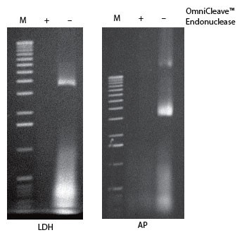 來(lái)自于大腸桿菌表達(dá)的LDH和AP的細(xì)胞裂解樣品用OmniCleave? Endonuclease處理或不加核酸酶處理。各取2 μl細(xì)胞裂解液進(jìn)行1%瓊脂糖電泳,核酸EB染色;泳道M,1 kb ladder。