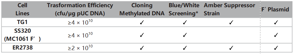 最高轉(zhuǎn)化效率的TG1感受態(tài)細胞,轉(zhuǎn)化效率≧4×1010 cfu/μg;