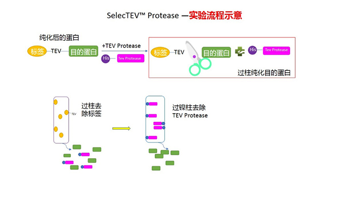 SelecTEV?蛋白酶是一種基因工程改造的煙草蝕刻病毒(TEV)蛋白酶,通過His標(biāo)簽的親和層析從大腸桿菌中純化,SDS-PAGE分析表明其純度為90%。SelecTEV?蛋白酶能夠識(shí)別Glu-Asn-Leu-Tyr-Phe-Gln-Gly七個(gè)氨基酸以及與其密切相關(guān)的序列,并在Gln和Gly殘基之間進(jìn)行切割。 這七種氨基酸序列在蛋白質(zhì)中很少見,使得SelecTEV?蛋白酶成為從融合蛋白中去除標(biāo)簽的理想選擇。利用蛋白酶N-末端的His標(biāo)簽通過親和層析即可從酶切反應(yīng)中除去SelecTEV?蛋白酶。