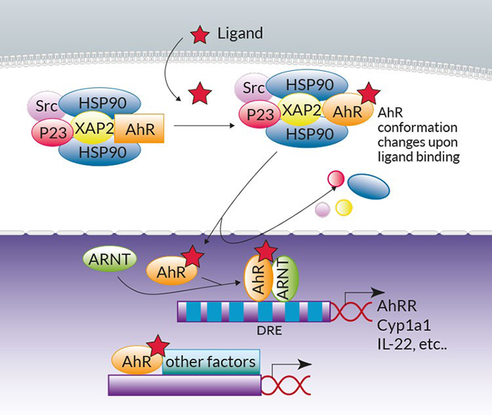 典型AhR訊號(hào)已經(jīng)被廣泛綜述過1。簡(jiǎn)而言之,在沒有配體的情況下,AhR位于細(xì)胞質(zhì)中Hsp90:XAP2:p23:Src伴侶蛋白復(fù)合物內(nèi),當(dāng)配體結(jié)合時(shí),復(fù)合物發(fā)生構(gòu)象變化并轉(zhuǎn)移到細(xì)胞核中。伴侶蛋白被釋放,AhR和AhR核轉(zhuǎn)位子(ARNT)異源二聚。在細(xì)胞核中,AhR:配體:ARNT三聚體與AhR靶基因上游調(diào)節(jié)區(qū)域的二噁英應(yīng)答元件(DRE)結(jié)合,以控制包括細(xì)胞色素P450依賴性單加氧酶Cyp1a1、AhR 抑制因子(AhRR)和IL-22白細(xì)胞介素的轉(zhuǎn)錄。值得注意的是,無輪是在基因組水平上通過與其他轉(zhuǎn)錄因子(例如NF-κB)相關(guān)聯(lián),還是在非基因組水平上(例如通過釋放Src激酶),非典型AhR信號(hào)通路也有被報(bào)道過2,3。