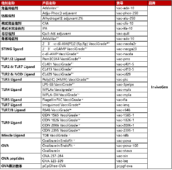 當(dāng)前,針對(duì)COVID-19的疫苗研發(fā)以前所未有的速度在世界范圍內(nèi)陸續(xù)開展,世界各地的科學(xué)家正在探索開發(fā)針對(duì)SARS-CoV-2的有效疫苗的所有潛在策略。大多數(shù)用于COVID-19的候選疫苗旨在誘導(dǎo)針對(duì)病毒S蛋白的中和抗體,防止病毒通過(guò)人ACE2受體攝取從而阻止感染。COVID-19疫苗開發(fā)前景的顯著特征是正在評(píng)估的技術(shù)平臺(tái)的多樣性,包括:減毒活疫苗,基于病毒載體的疫苗,基于重組蛋白的疫苗,DNA疫苗和RNA疫苗。其中重組蛋白疫苗通常使用SARS-CoV-2蛋白(例如S蛋白)在宿主中引起免疫反應(yīng)。通常與佐劑結(jié)合使用以提高免疫原性。迄今為止,已進(jìn)入臨床試驗(yàn)的COVID-19候選疫苗包括Moderna開發(fā)的mRNA疫苗(NCT04283461)和康希諾 (NCT04341389)開發(fā)的重組腺病毒疫苗。此外,諸如AS03和MF59等佐劑正在重組蛋白疫苗中進(jìn)行探索,使用佐劑可增強(qiáng)免疫原性并降低劑量,使更多人接種疫苗成為可能。天然免疫專家InvivoGen提供科研用途的佐劑和OVA產(chǎn)品供研究人員選擇。